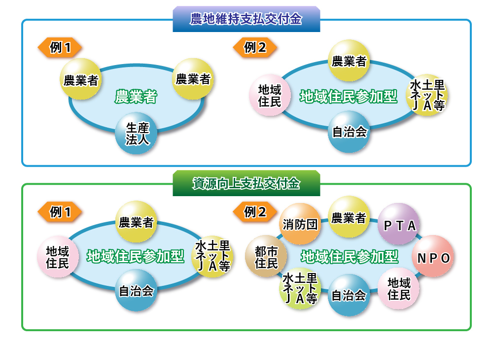多面的機能支払交付金は、支援対象となる活動に応じて、①農地維持支払交付金②資源向上支払交付金から構成されています。